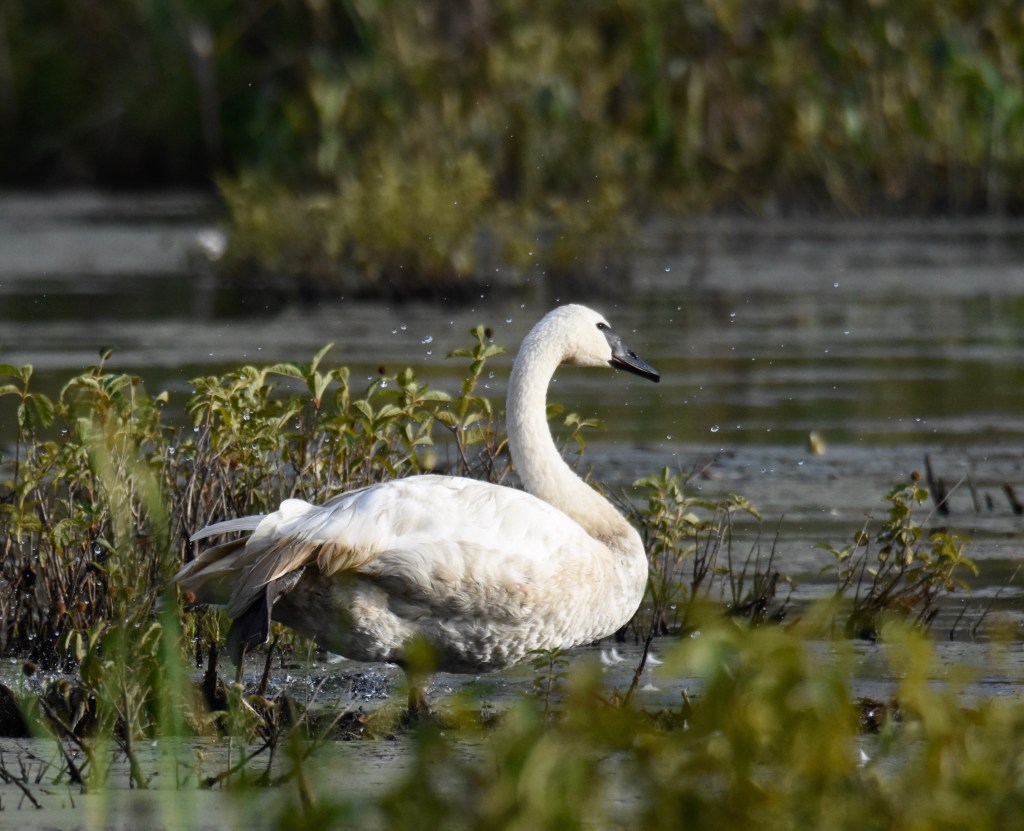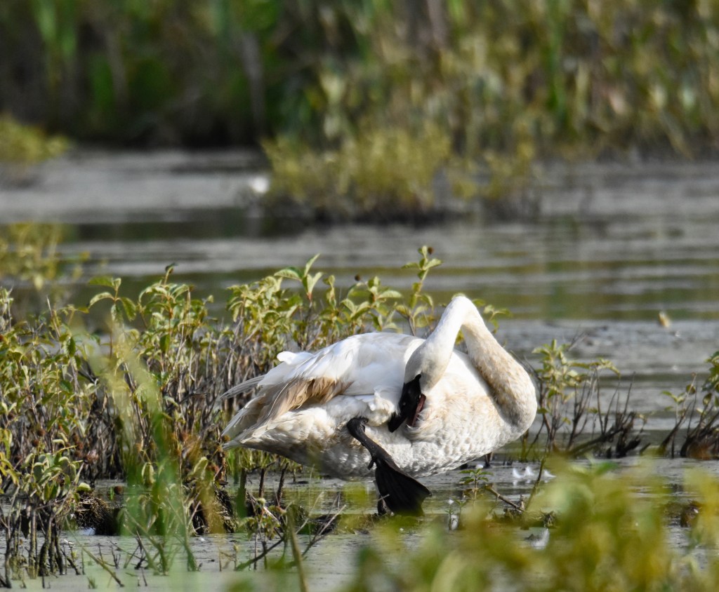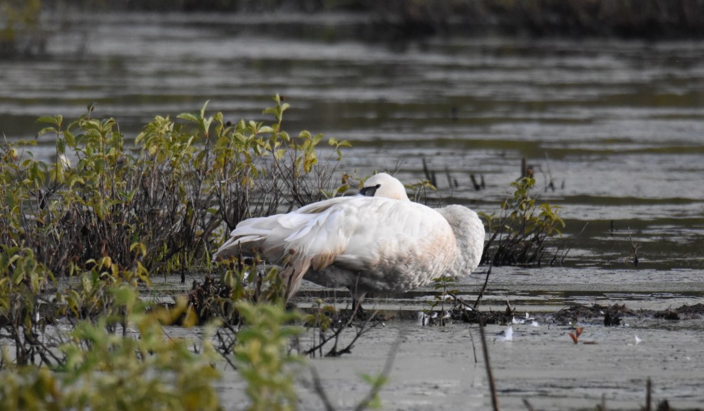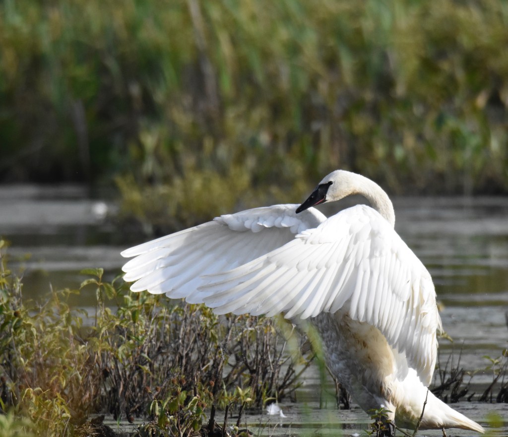 The cooler temperatures are here and I decide to venture out into the wilds. I return to the marsh to see our NH Trumpeter Swan, who I’ve named”Louie”, but I can’t find him anywhere. I keep searching, dragging myself and my heavy lens into the woods. No swan in sight. Could he have already migrated? I decide to call to him, even though some may not approve, to let him know he has a friend. “Ko-Hoh! Ko-Hoh!” I trumpet softly. I have grown attached to this swan because I know how special he is. I know the tragic past of the Trumpeter Swan and how it has only partially recovered its pre-colonial numbers. He paddles out from behind the reeds. “Louie!” I can hardly contain my excitement as I try not to disturb him. He pretends to ignore me, but he knows that I am there, and I know that he knows. He feels safe here, and that is a good thing.