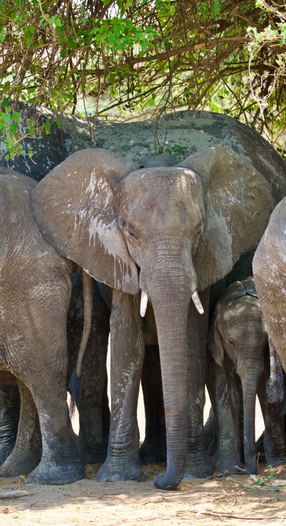 The African Savannah Elephant is the biggest elephant in Africa, and the largest concentration of these is in Botswana. We find this small herd under a shade tree attempting to stay cool in the 95-degree heat.