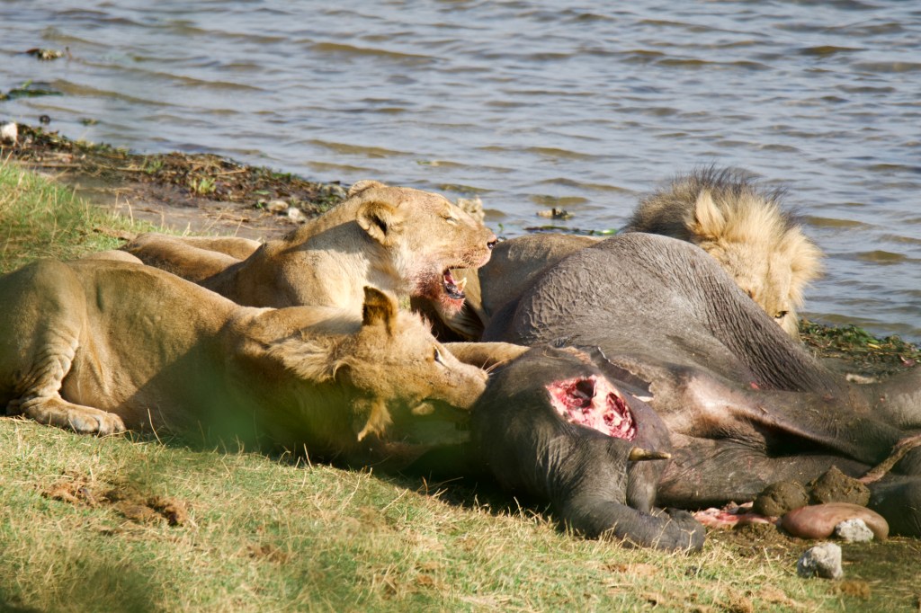 The guides catch wind of a Lion kill. The large felines have taken down a baby elephant, close to where the herd comes in. When the herd of elephants arrive on the river bank, we wonder if it is the same group that lost a baby, but this herd doesn’t seem to react when they see the bloody scene.