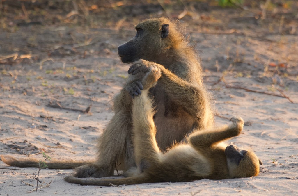 On the way home, we spot an older Baboon who is grooming a younger Baboon. It looks like a doctor giving its patient a medical exam. 🙂 “How does it feel when I do this?”