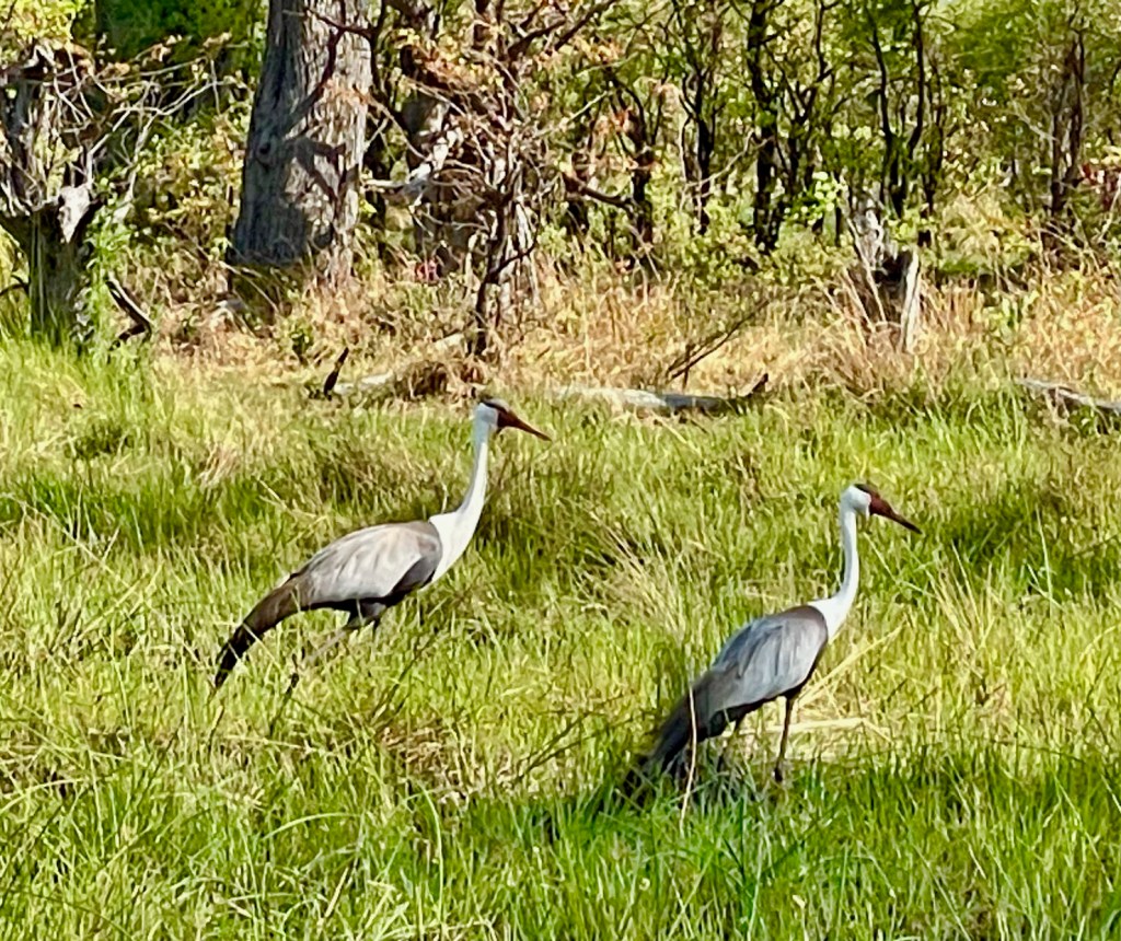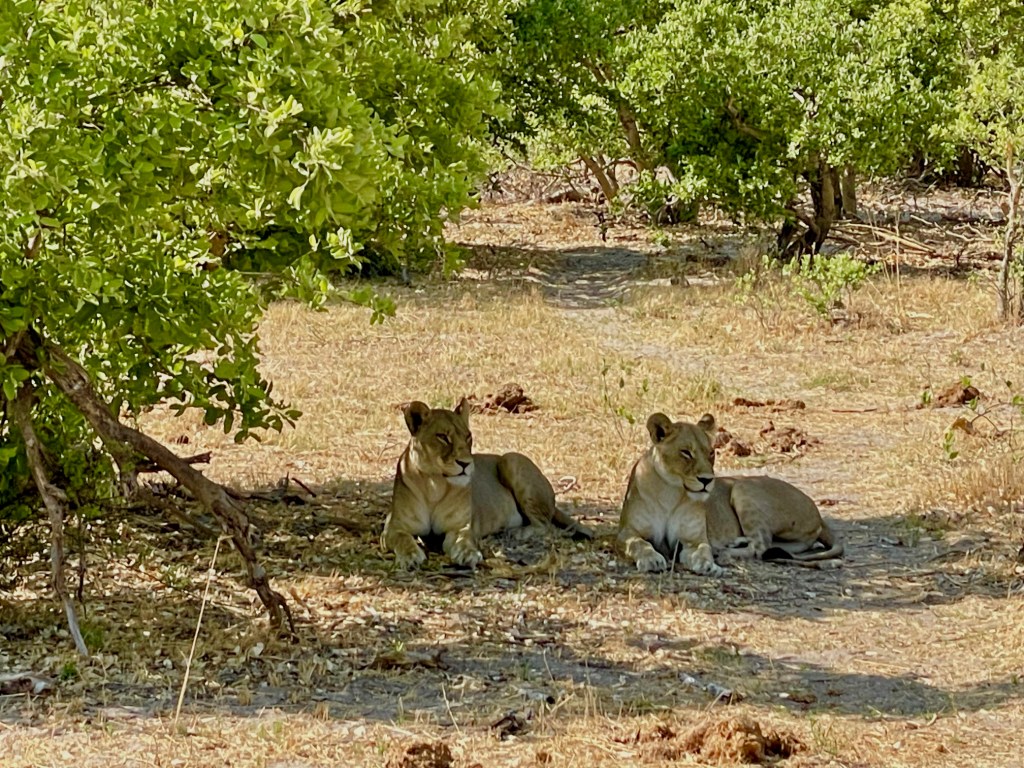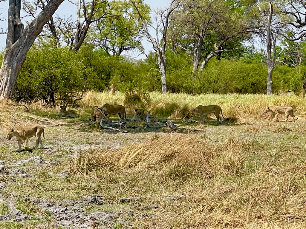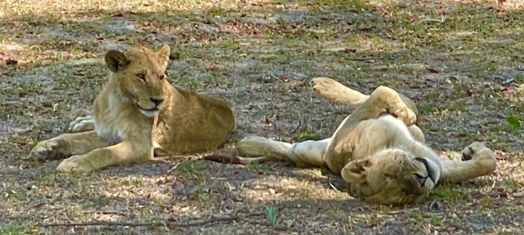 We hear there is a lion pride in the area. On the way to see the lions, we stop to see two Wattled Cranes. These cranes are endangered because of agricultural expansion and degradation of its wetland habitat, according to the African Wildlife Foundation, a conservation group working to protect the species. Wattled cranes depend upon healthy wetlands. Below, they are foraging in the moist grasslands close to the delta.