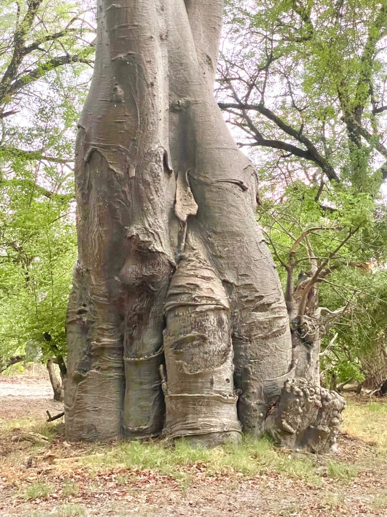 This Baobab tree stands across the path. Seriously … the tree trunk looks like elephant’s feet?