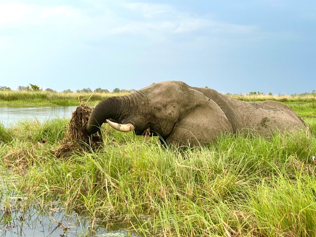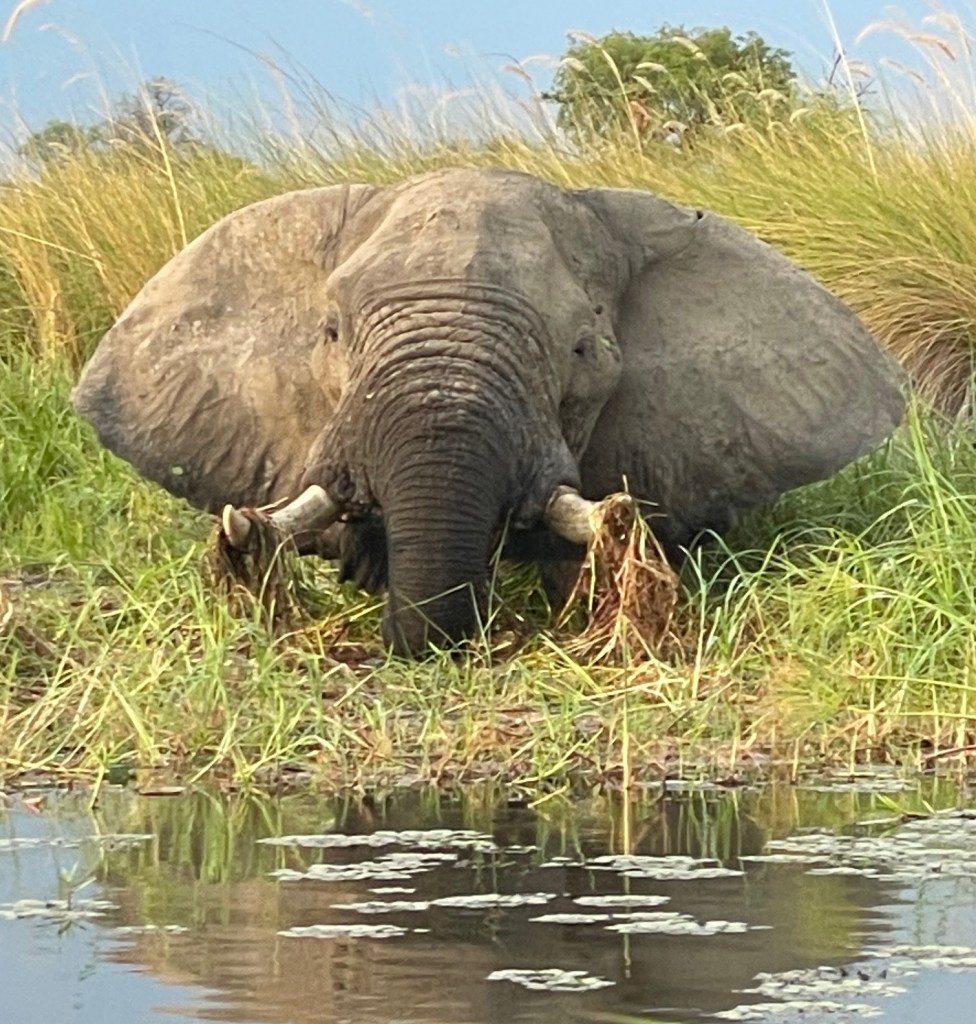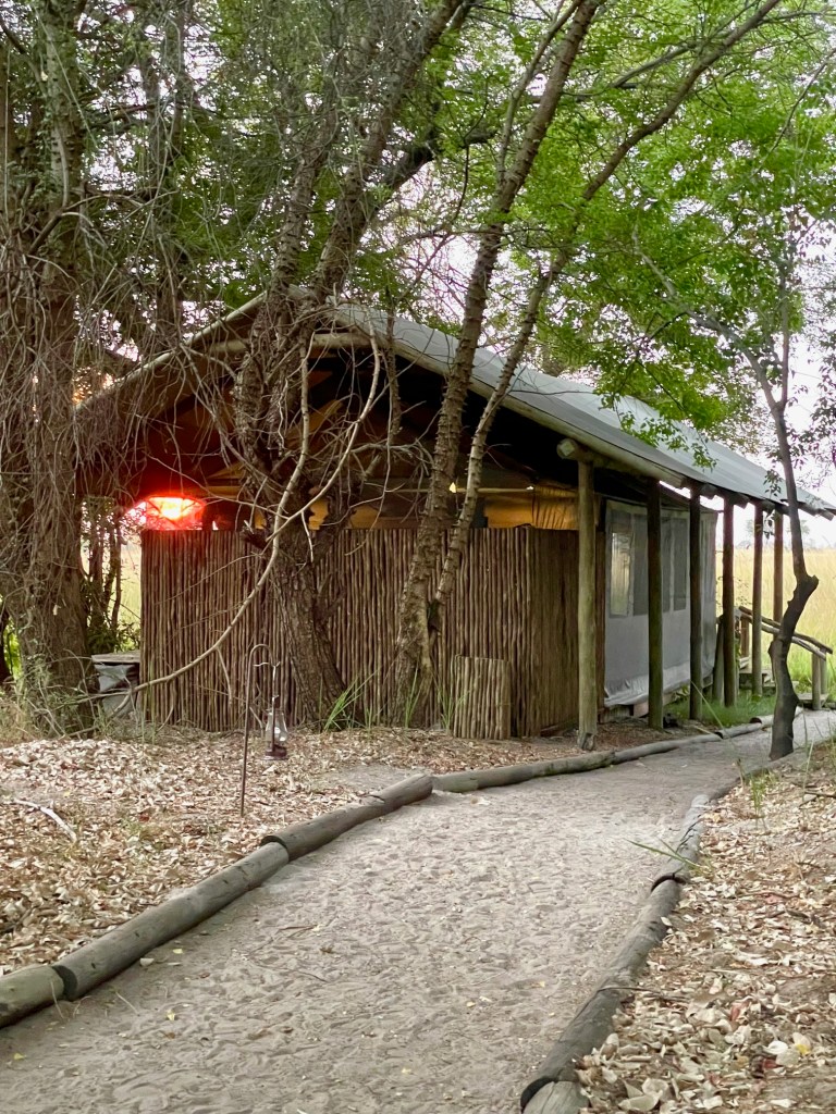 Camp Xakanaka sits on the Southeast edge of the delta. When I try to pronounce the name of the camp, our guide Onx Manga says “just call it Camp X” which makes me laugh. One of the bumpiest- roads-ever leads to the camp where my tent stands next to the river. Fortunately, the lions are NOT roaring outside my room tonight, so I sleep like a child. On the way to the front door of my tent, however, I still have to be aware of potential lion, hippo and alligator.