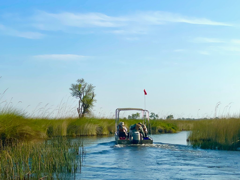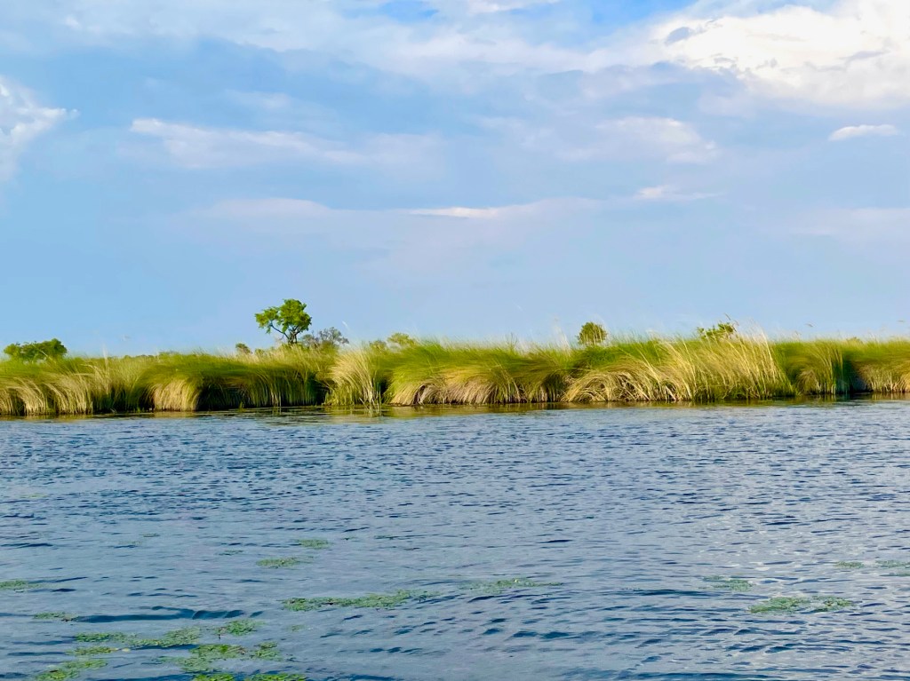 In the afternoon, it is by covered boat that we begin to explore the myriad canals and waterways. Water Lily and Papyrus plants grow and thrive here. These plants, along with the hippos, help create all the channels. In the delta, boaters are required to install a tall metal pole with a red or orange flag on top so that other boaters can see them coming.